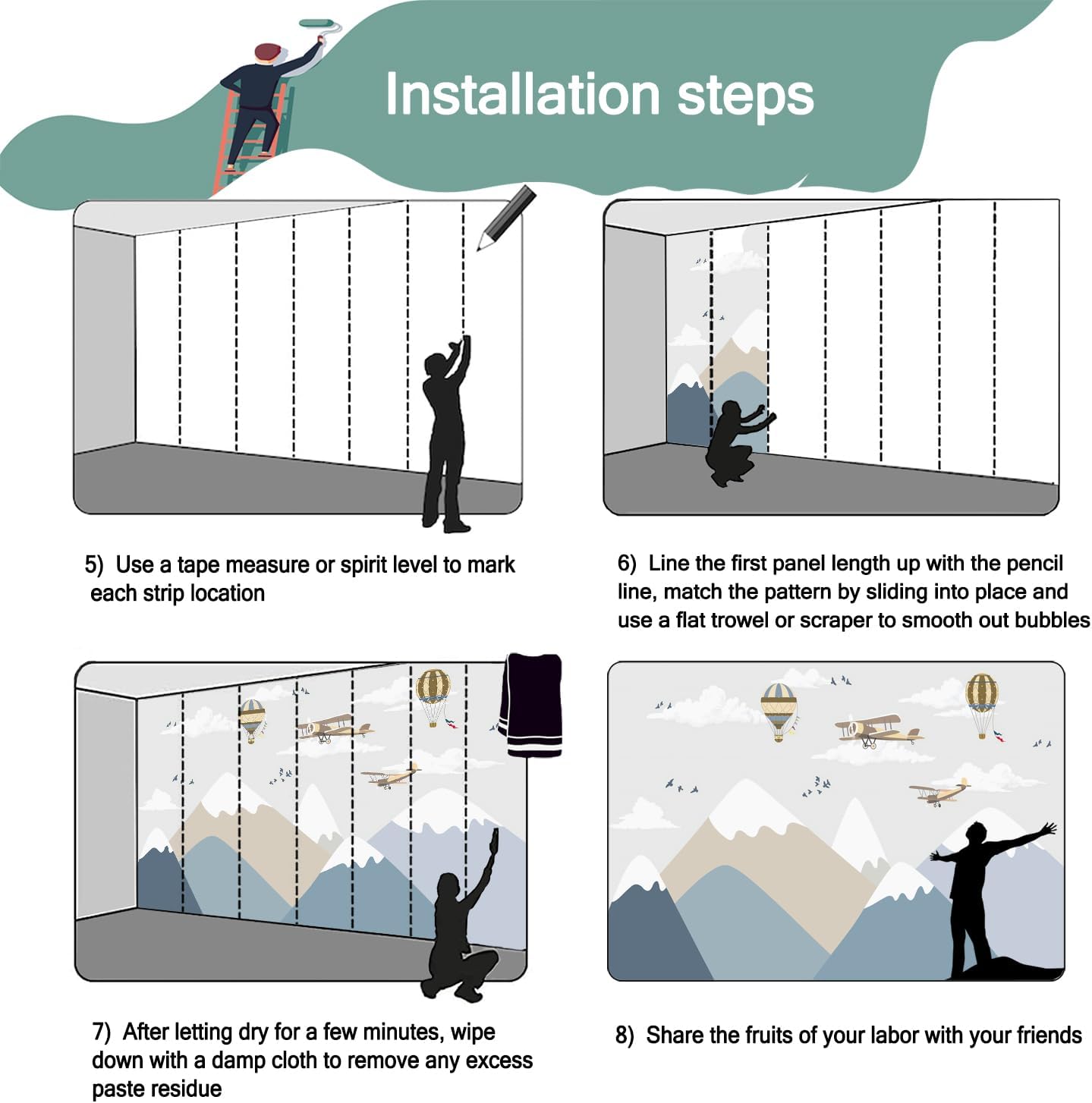 - Mural wallpaper size: 100 "W x 65 "H, divided into 5 sections, each section is labeled with a number underneath, there is no need to overlap the pattern when installing, just install according to the number labeled underneath the panel